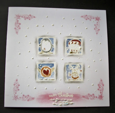 This final card was an experiment stamping and embossing in white, but I wasn't happy with the effect as the image and sentiment didn't show up well. Rectified with a bit of shading with ink from ink pads around the images and the wording. Corners added in same colour and some Let it Snow.
